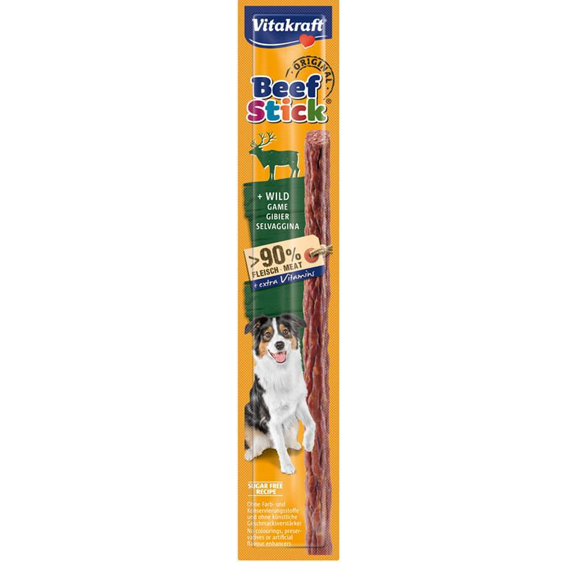 Laat je verrassen door de Vitakraft Beef Stick Wild. Door de topkwaliteit, de verrukkelijke geur, het zeer hoge vleesgehalte en de unieke smaak kan het geluk van je hond niet meer op. Overigens is deze smakelijke hondensnack verkrijgbaar in verschillende smaken, waaronder wild. Welke smaak je ook kiest, het wordt gegarandeerd smullen! Wist je dat de Beef Stick Wild een suikervrij receptuur heeft en geen kleurstoffen, conserveringsmiddelen en smaakversterkers bevat? Dat maakt deze hondensnack niet alleen extra lekker, maar ook heerlijk puur van smaak! Kortom, de Beef Stick Wild is pure verwennerij voor je geliefde hond.
